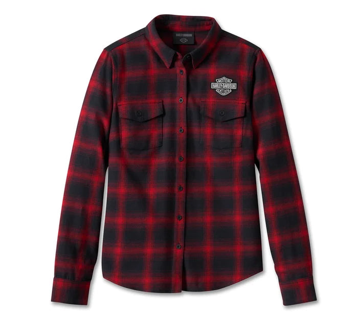 Realizzata in twill di cotone spazzolato di peso medio, la nostra camicia in flanella a maniche lunghe retrò Old American in edizione limitata abbraccia un look classico con la sua silhouette tradizionale e il caldo motivo scozzese. Questa maglietta da donna a maniche lunghe è dotata di tasche sul petto con patta e bottone e di un colletto con bottoni automatici nascosti che non si svolazza sotto l’attrezzatura da equitazione. La parte anteriore è marchiata con il nostro logo più iconico, mentre la parte posteriore mostra la nostra grafica stagionale con splendidi ricami a punto catenella. Assicurati subito questo intramontabile look Harley-Davidson: le scorte sono limitate.