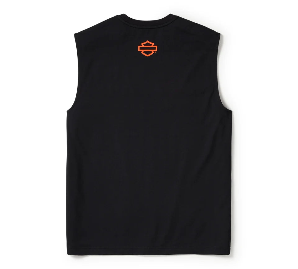 Lo stile moto moderno devia sul pratico con la canotta H-D® TECH Coolmax®. Realizzata in tessuto misto cotone/poliestere Coolmax®, è ideale per controllare la sudorazione in modo efficace. Questo smanicato da uomo presenta una composizione a contrasto e una fettuccia interna con logo sul collo per un look ricercato, oltre al girocollo in costina che non si sforma. Il suo stile H-D contemporaneo esibisce le nostre vivaci grafiche su entrambi i lati.