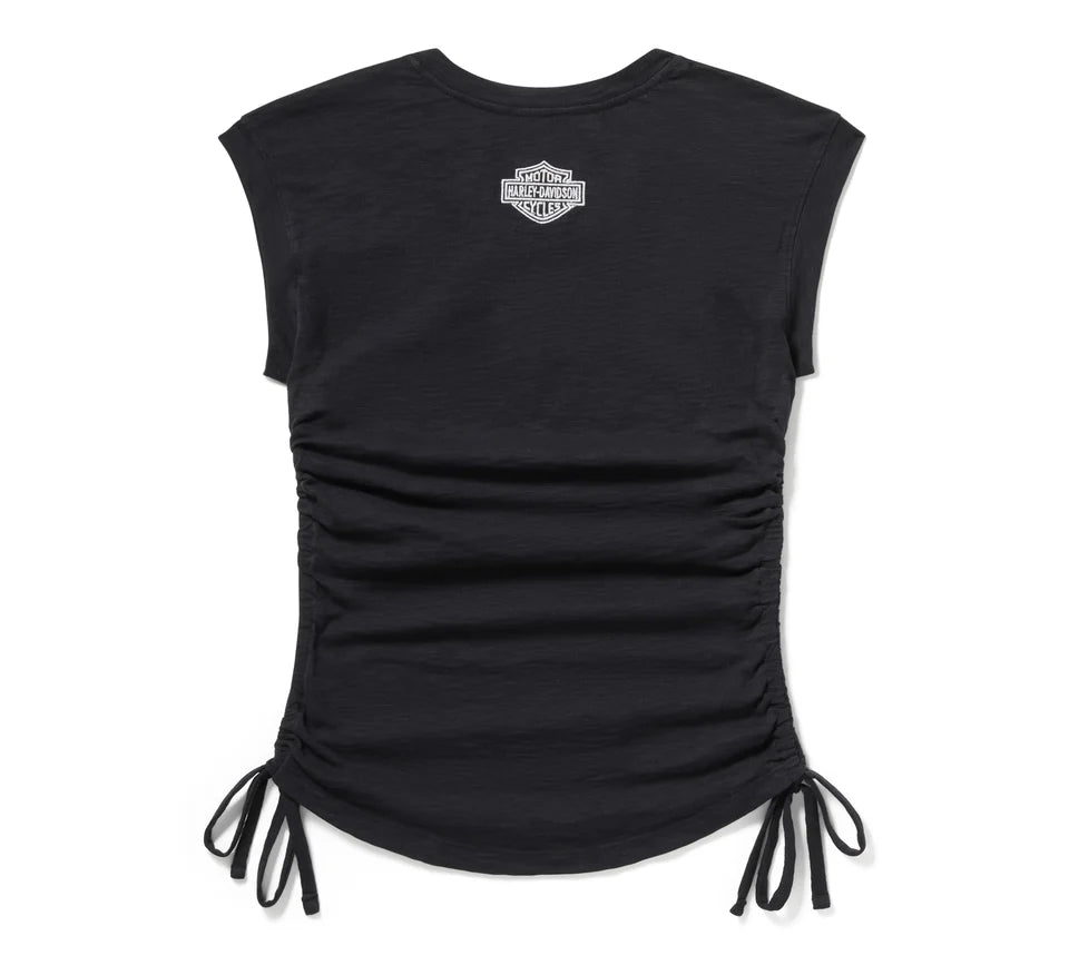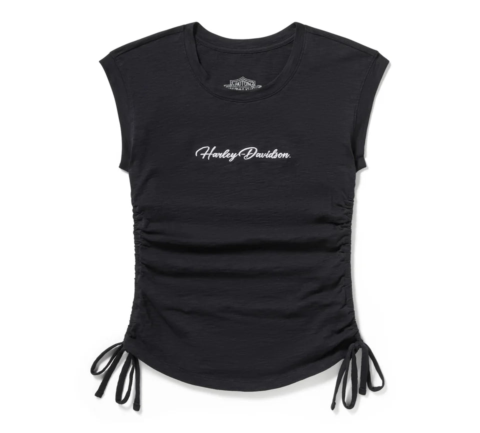 The Essential Ruched top is the ultimate flattering top. Crafted from ultra-soft slub cotton with a subtle texture (zoom in to see). This feminine top features cap sleeves, side ruffles with adjustable ties to slim the waist, and an exaggerated rounded hem to visually elongate the legs. The HD identity is present with a subtle version of our logo, embroidered on the front and back.