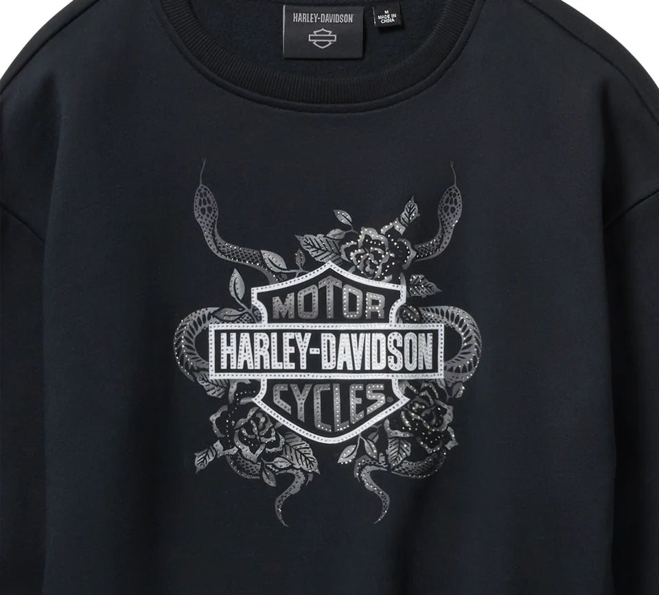 Proof that a sweatshirt can be comfortable without sacrificing edginess is our Serpent Rose Bling. It's crafted from a cotton/polyester blend fleece with dropped shoulders for a relaxed fit and ribbed trims that won't lose their shape. What makes this crewneck sweatshirt impossible to ignore, however, is the eye-catching image of a snake meeting a rose, adorned with rhinestones.