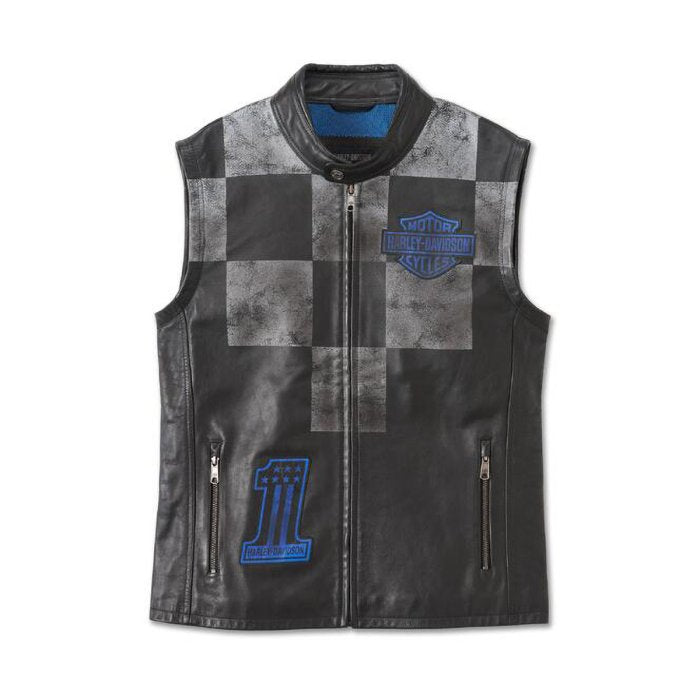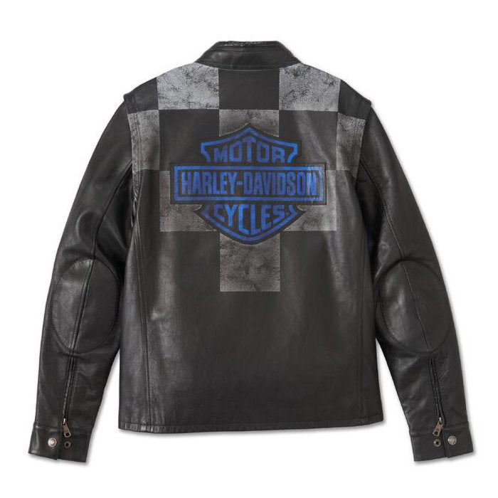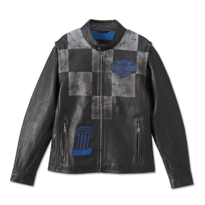 Harley-Davidson® Men's Leather Jacket 97028-24VM. Double your style options with the limited-edition Blue Steel Convertible Leather Jacket. This leather masterpiece can be worn as a jacket or a vest. Simply attach or detach the sleeves with the zippers, depending on your preference. The jacket features zippered pockets for storing personal items, adjustable snap cuffs, and a snap-tab collar. The refined look comes from the elbow patches, unique dip wash, and race-inspired imagery. The #1 logo on the front and inner lining first appeared in 1969 to celebrate our AMA Grand National Championship win. Don't miss out on this exclusive style—order now.